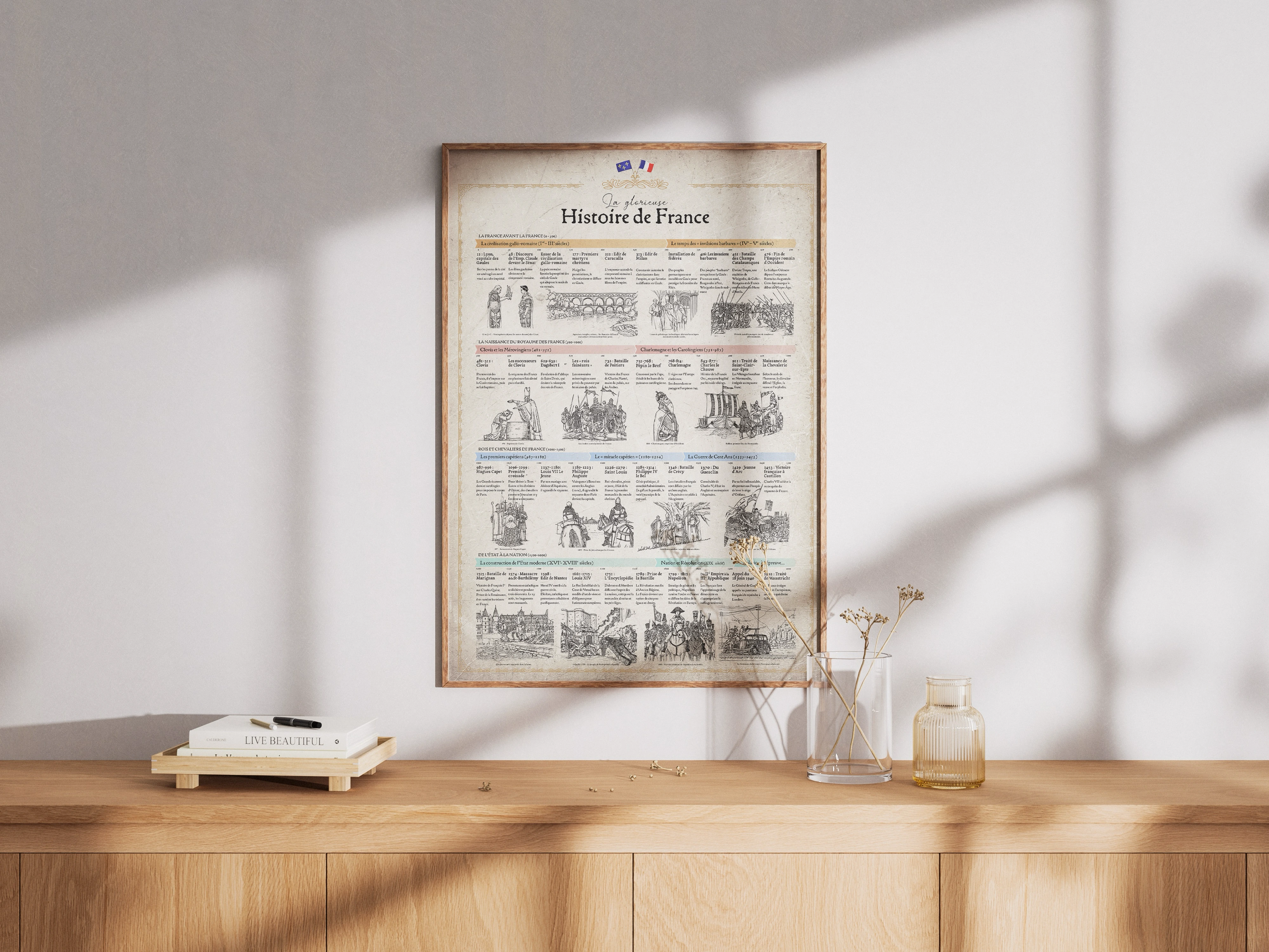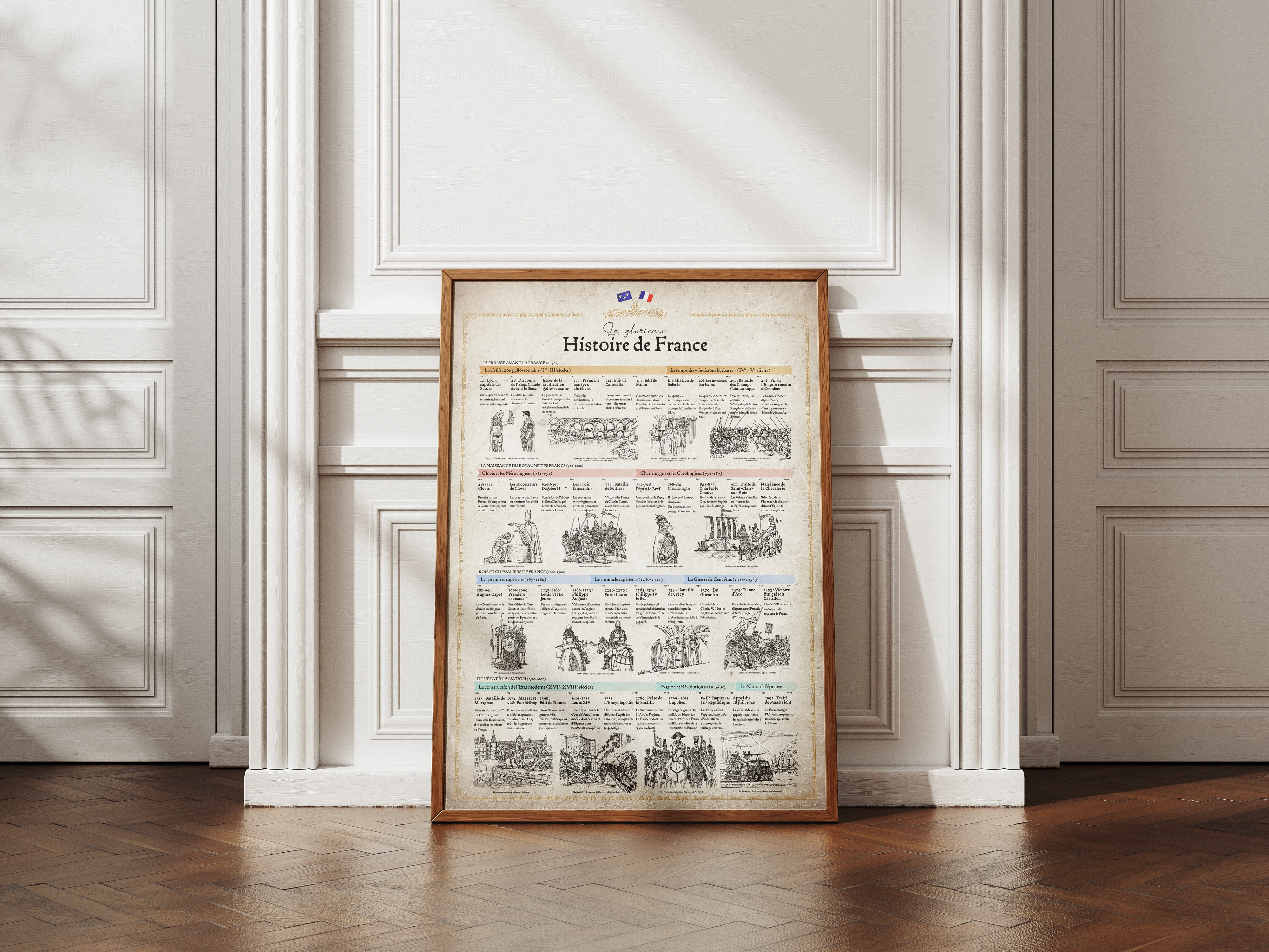 Notre frise illustrée est plus qu’une décoration murale ; elle permet de voyager à travers l’Histoire et invite petits et grands à explorer les épopées marquantes de la France, depuis l’an 0 jusqu’à notre ère moderne. Tous les cinquante ans, une nouvelle séquence historique vous attend !