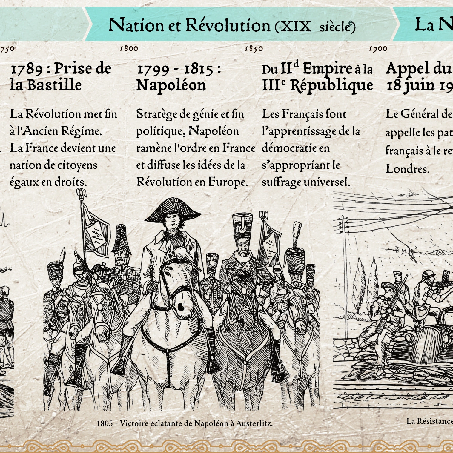 Rigueur historique : Conçue en collaboration avec des historiens, notre frise offre un aperçu fidèle des moments pivot de l’histoire française.